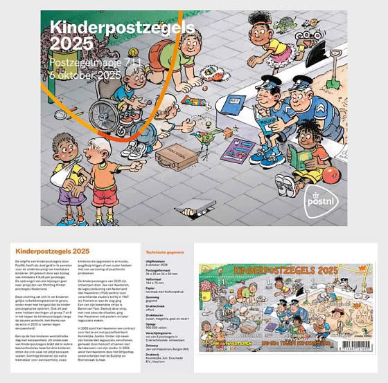 2025年10月6日,荷兰邮政将发行一版面值为1的儿童福利邮票,用于荷兰境内邮寄。邮票共五枚,包括一枚大邮票和四枚小邮票,由荷兰最著名的拼图插画家Jan van Haasteren设计。设计体现了本次活动的主题:携手对抗孤独。与往常一样,这些邮票将于秋季通过小学生上门销售。一版五枚邮票售价9.80欧元,每枚加收0.65欧元的附加费。