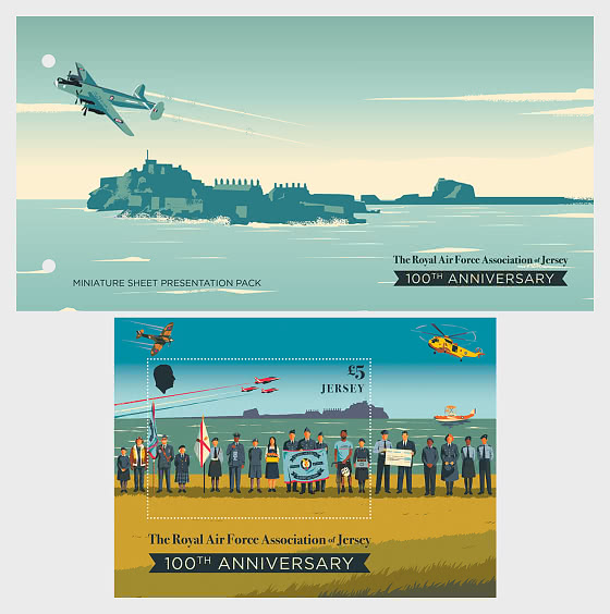 Jersey Post hat zum Jubiläum der Royal Air Force Association (RAFA) Jersey einen Satz mit sechs Briefmarken, einem Souvenirbogen und einem Kleinbogen herausgegeben. Die Gestaltung stammt von dem großartigen Harry Milburn, der sich von originalen Rekrutierungsplakaten der RAF inspirieren ließ und den Briefmarken einen Hauch moderner Nostalgie verleiht.
