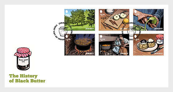 La Historia de la Mantequilla Negra rinde homenaje a una de las conservas más apreciadas de Jersey. La edición, ilustrada por Chris Wormell, incluye una serie de seis sellos y una hoja miniatura.