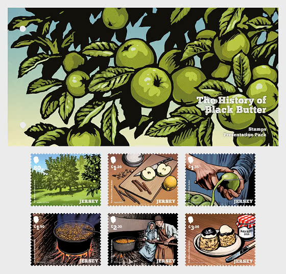 La Historia de la Mantequilla Negra rinde homenaje a una de las conservas más apreciadas de Jersey. La edición, ilustrada por Chris Wormell, incluye una serie de seis sellos y una hoja miniatura.