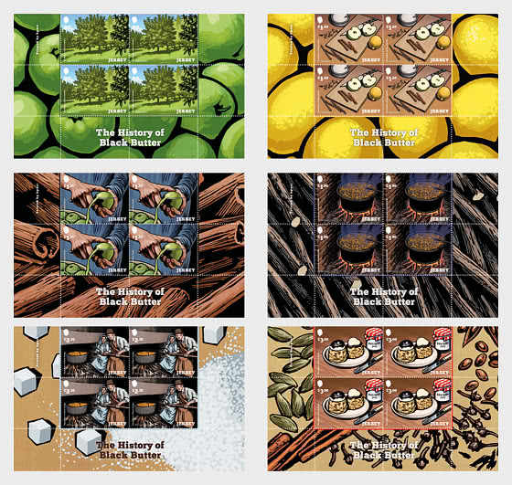 L'Histoire du Beurre Noir célèbre l'une des confitures les plus appréciées de Jersey. L'émission, illustrée par Chris Wormell, comprend une série de six timbres et un bloc-feuillet.