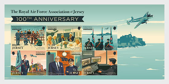 La Poste de Jersey a émis une série de six timbres, un bloc-feuillet et un bloc-feuillet en l'honneur de l'anniversaire marquant de la Royal Air Force Association (RAFA) de Jersey. L'illustration est signée par le remarquable Harry Milburn, qui s'est inspiré des affiches de recrutement originales de la RAF, apportant une touche de nostalgie moderne aux timbres.