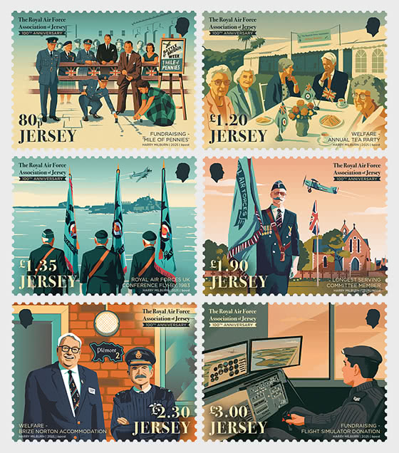La Poste de Jersey a émis une série de six timbres, un bloc-feuillet et un bloc-feuillet en l'honneur de l'anniversaire marquant de la Royal Air Force Association (RAFA) de Jersey. L'illustration est signée par le remarquable Harry Milburn, qui s'est inspiré des affiches de recrutement originales de la RAF, apportant une touche de nostalgie moderne aux timbres.