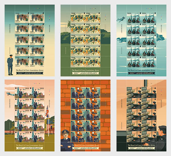La Poste de Jersey a émis une série de six timbres, un bloc-feuillet et un bloc-feuillet en l'honneur de l'anniversaire marquant de la Royal Air Force Association (RAFA) de Jersey. L'illustration est signée par le remarquable Harry Milburn, qui s'est inspiré des affiches de recrutement originales de la RAF, apportant une touche de nostalgie moderne aux timbres.