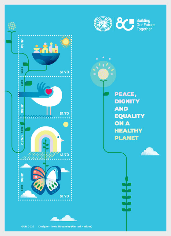 L’Administration postale des Nations Unies émet trois feuilles de timbres le 24 octobre 2025 pour célébrer le 80e anniversaire des Nations Unies.