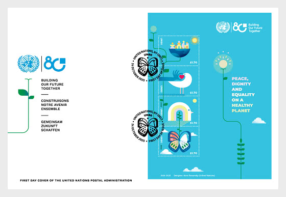 L’Administration postale des Nations Unies émet trois feuilles de timbres le 24 octobre 2025 pour célébrer le 80e anniversaire des Nations Unies.