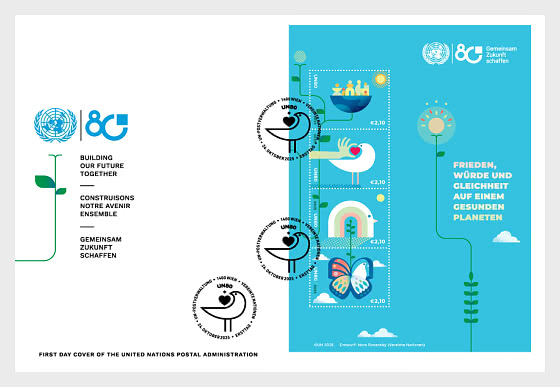 L’Administration postale des Nations Unies émet trois feuilles de timbres le 24 octobre 2025 pour célébrer le 80e anniversaire des Nations Unies.
