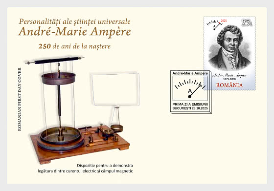 Romfilatelia et Poșta Română mettent en circulation le mardi 28 octobre de cette année une émission anniversaire consacrée à un grand scientifique français sous le titre générique « Personnalités de la science universelle », André-Marie Ampère, composée d'un timbre-poste et d'une enveloppe Premier Jour.