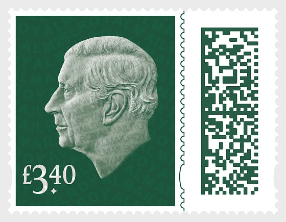 Un nuovo francobollo ordinario da £ 3,40, che rappresenta la nuova tariffa postale internazionale per lettere fino a 100 g, sarà introdotto da Royal Mail il 30 settembre 2025. Il francobollo da £ 3,40 è stampato in verde scuro. L'effigie del Re appare accanto a un codice a barre 2D stampato in tinta con il corpo principale del francobollo, separato da una linea di perforazione simulata.