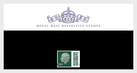 Un nuovo francobollo ordinario da £ 3,40, che rappresenta la nuova tariffa postale internazionale per lettere fino a 100 g, sarà introdotto da Royal Mail il 30 settembre 2025. Il francobollo da £ 3,40 è stampato in verde scuro. L'effigie del Re appare accanto a un codice a barre 2D stampato in tinta con il corpo principale del francobollo, separato da una linea di perforazione simulata.