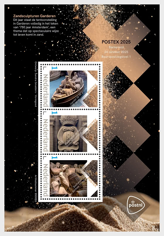 В честь Postex 24 октября 2025 года PostNL выпустит биржевой марочный блок Postex № 1 2025. В этом году выставка в Гардерене полностью посвящена «750-летию Амстердама» — теме, эффектно воплощенной в песке.